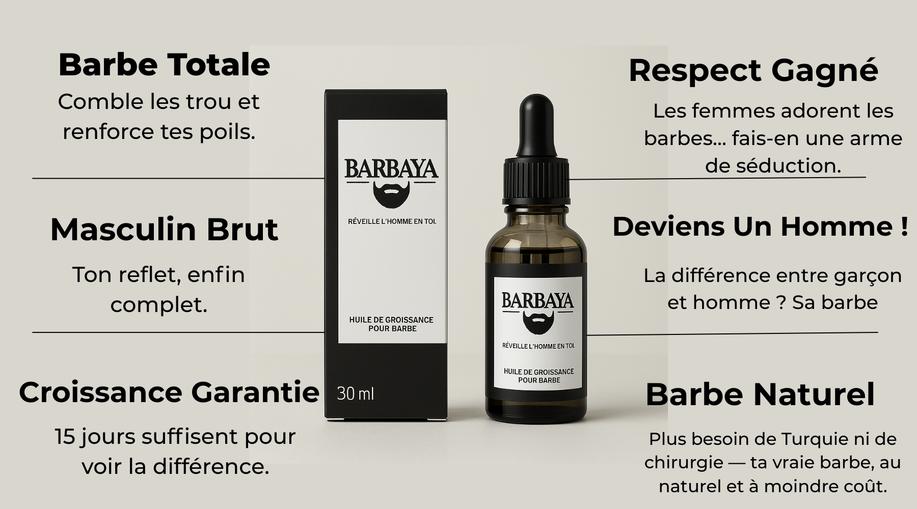 🧴 L’huile Barbaya — notre formule naturelle marocaine, riche en argan, biotine et vitamines, qui stimule la pousse et nourrit ta barbe en profondeur.